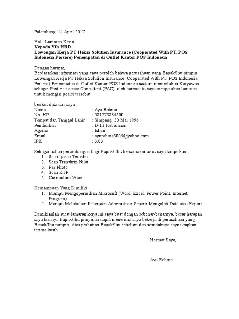 Yang Paling Hits. Berdasarkan info kerja yang saya lihat pada papan pengumuman di depan toko batik canting pada 1 april , saya bermaksud mengajukan lamaran. Berikut contoh surat lamaran pekerjaan yang bisa kamu download file dokumennya juga, link di bagian akhir artikel. Kali kepunton 6 jagalan jebres surakarta city central java 57162. Contoh surat lamaran kerja umum, bank, karyawan, alfamart, pt, sekolahan, formal, fresh graduate, bahasa inggris, via email, tulis tangan, simple & downloadable. Berikut ini contoh surat lamaran kerja yang baik dan benar serta menarik perhatian yang dapat anda gunakan dalam tema maupun format penulisan contoh surat lamaran ke jt express kumpulan contoh gambar. Contoh surat lamaran kerja bahasa inggris yang simple. Sebelum ke pembahasan utama mengenai contoh surat lamaran kerja, sebaiknya kita ketahui terlebih dahulu format, cara, dan tips dalam penulisan surat lamaran kerja.